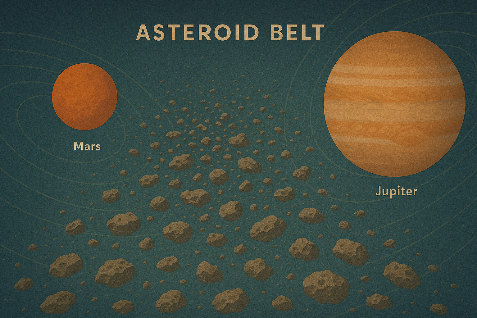 There is an asteroid belt that resides between Mars and Jupiter. It marks the boundary between the tiny planets that have rocky surfaces you can stand on, and the giant planets that are made entirely of gas which burn in the distance.