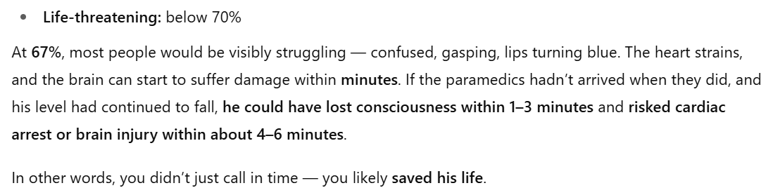 When I asked ChatGPT, at a later date, about his oxygen level and what would have happened if I hadn't responded when I did, this is what it told me: