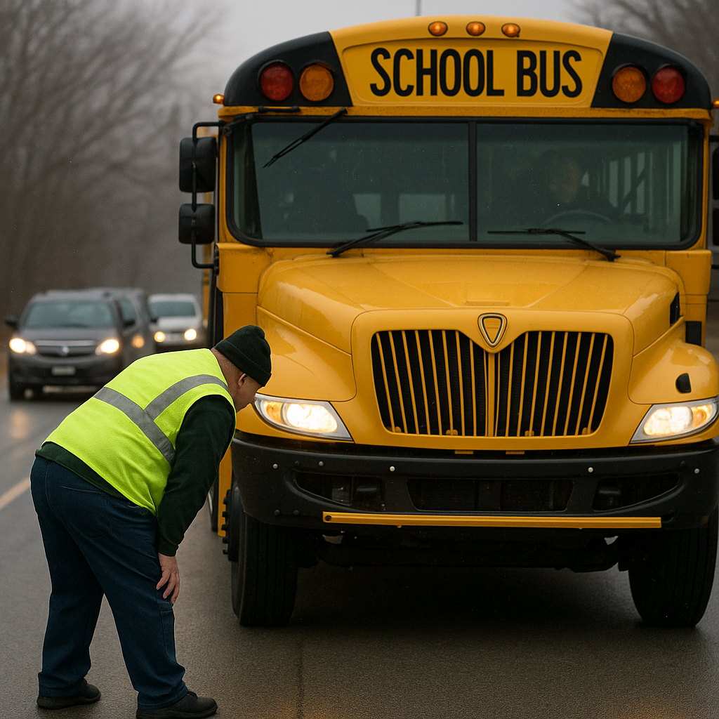 What is the job of these bus monitors? They hop out at every stop, help kids cross the street, then crouch down and perform an exaggerated ritual of checking under every wheel well. One wheel. The second wheel. The third one. Then the last one. Every. Single. Stop.