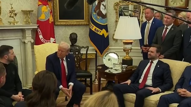 Enter J.D. Vance. Trump turned to him towards the end of the press conference and asked him to say a few words. When he stopped talking, Zelenskyy leaned forward and asked him if he could ask him a question. JD leaned forward and said, "Of course."